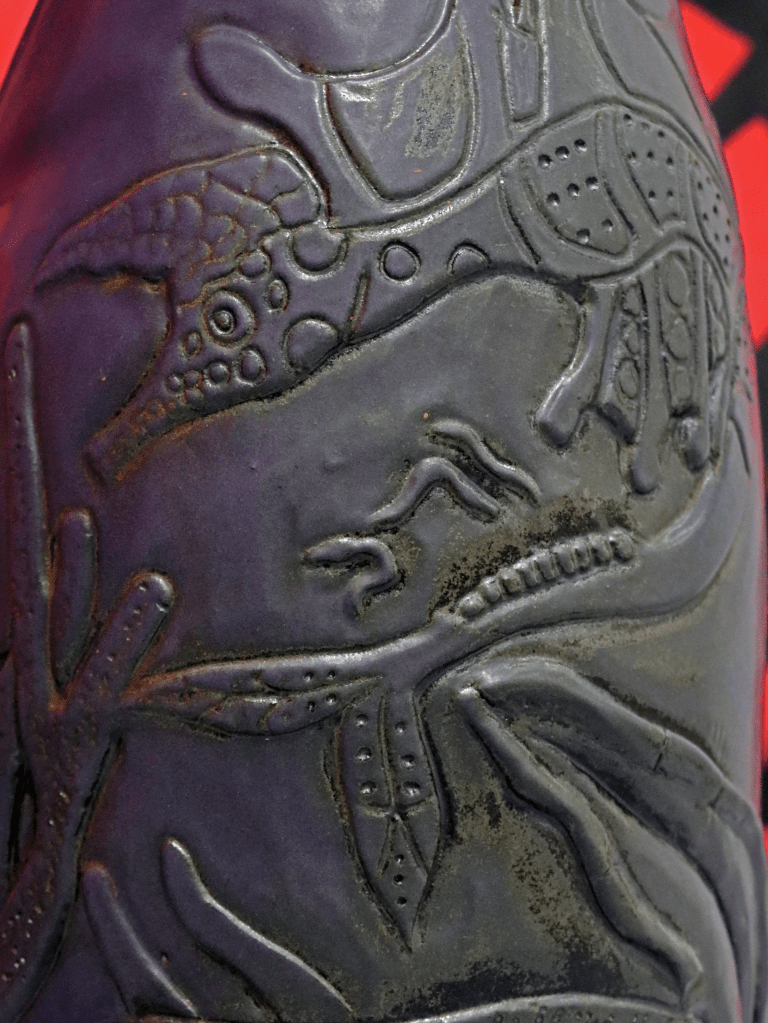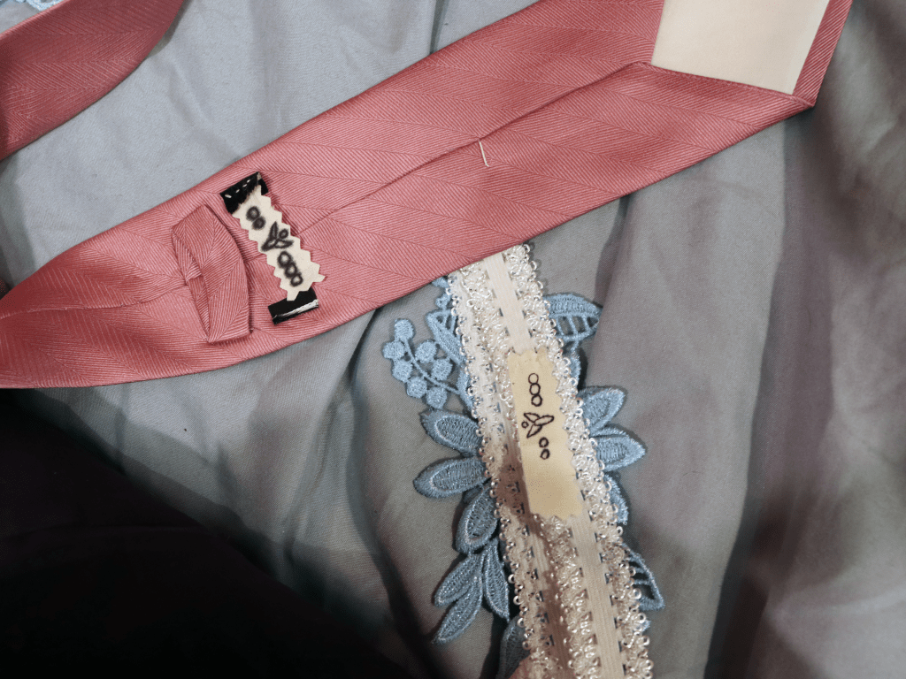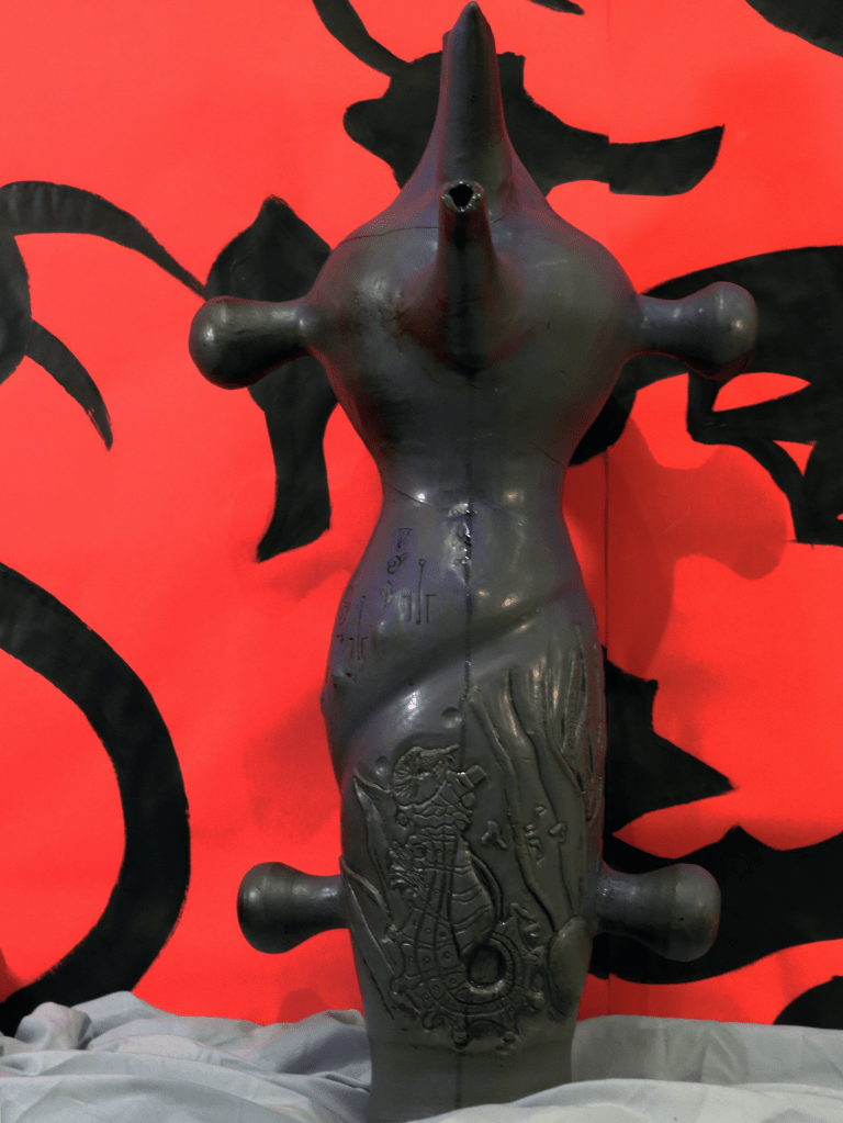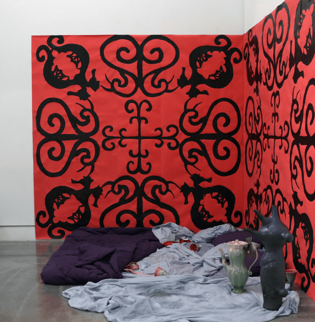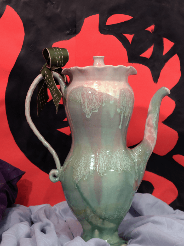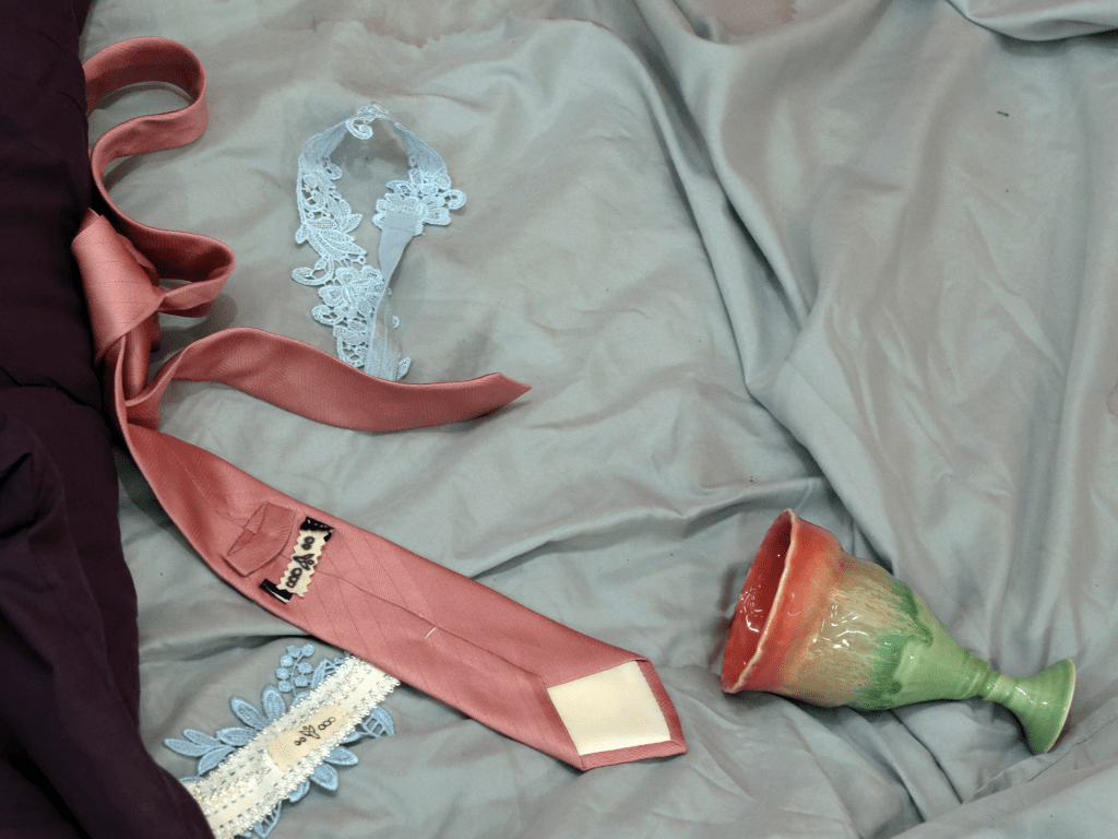 “Goblina and the Magic Ribbon: The Night After,” is an interactive installation where the viewer is able to step into a moment of a story: the night after a wedding. By investigating the objects on the bedspread, including labelled garters and ties, hand-painted wallpaper, and ceramic vessels, the viewer can piece together what happened ‘last night.’ As they investigate, the notion of a traditional marriage falls apart, replaced by the story the work tells of a polyamorous, transsexual relationship, confronting the viewer with their own assumptions regarding what gets to be called, ‘love,’ ‘marriage,’ and ‘normal.’ The mixture of commonplace objects, such as the comforter and pillows, and fantastical objects, such as the ewer, jug, and wallpaper, conflate the line between our reality and the fictional world I’ve created. From this liminal space, the viewer can reconsider the assumption that our reality is the only possible one as they live a moment in another.