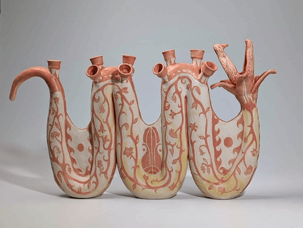 Loufithi Tulipiere is an investigation into combining different eras of ceramics: traditional greek floral imagery on a delfware-inspired tulipiere. The vessel form is inspired by the story of the D&D campaign, Goblina and the Magic Ribbon. Inspired by the greek metamorphic mythology of flowers and the Orobouros, the Loufithi is a revered aquatic god in a constant cycle of birth, death, and rebirth, protecting Stamvathes isle of Nesink from beneath the waves.